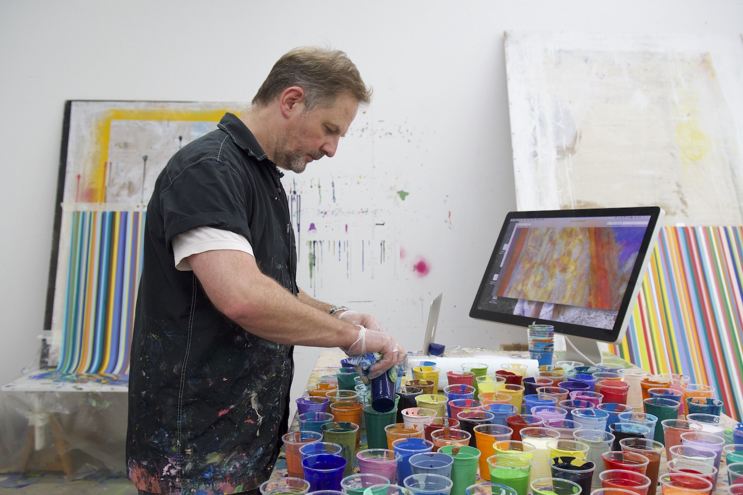 Several Ian Davenport’s paintings have been acquired by many collections across the world, such as the Arts Council of Great Britain, the Tate Gallery, and the Weltkunst Collection in Zurich. As well, the first monograph of his work was published in 2014 by Thames & Hudson. Currently residing in London, the artist has been experimenting with screen-printing and etching over the past 10 years, building a portfolio of graphic work that resembles the elegant lines in his drip paintings. This kind of work Davenport has been delving into replicates the look of his paintings, however the texture is completely different. In recent years, he’s also being experimenting with different starting points of colour dripping, with his 2017 pieces letting gravity control the movement of paint from dots scattered on a canvas in different colours, rather than his typical stripes.
